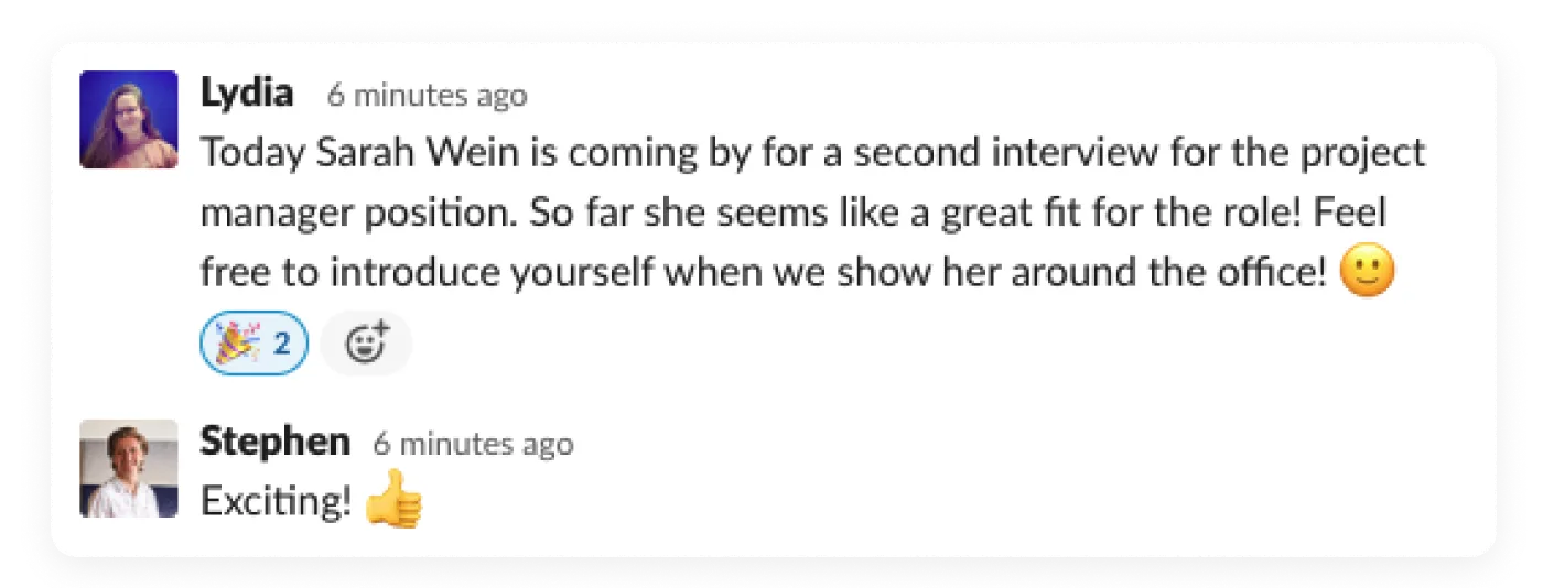 Keep your team in the loop. Hiring a new team member is exciting for everyone involved so share the fun. And not just with the hiring team! Let the whole company know how many qualified people applied, when candidates are coming by for interviews, and when you're getting close to a hire. This helps to build it into your company culture that hiring is a shared responsibility. Team members that are not involved in one hiring round will get excited to be involved in a next hire.