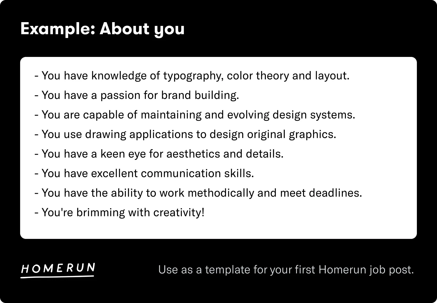 These are the requirements or "About the candidate". But since we're addressing the candidate directly it should be "About you". This is where we suggest you use bullet points, as it's important to be to the point about what you're looking for in a candidate. Make sure that these bullet points only make up 1/3 of your job post, though. So only include the must-haves and leave out nice-to-haves for a gender-balanced pipeline and the highest amount of quality applications.