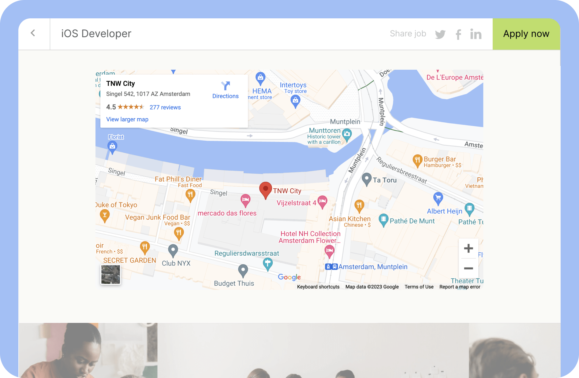 Embed interactive maps within your career page or job posts to display the location of your office or other event venues. Candidates can then visualize the location, assess commuting times and explore the surrounding area. For in-person and hybrid roles, this can help candidates make informed decisions about their interest and suitability for the position based on location factors. Google Maps is also used to provide accurate directions for hiring events or interviews, which helps to streamline the logistics of your hiring process and enhances the candidate experience.