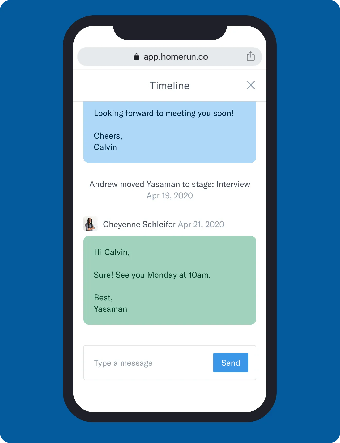 Stay in touch with candidates from any device with our rebuilt dashboard that is now fully responsive on mobile and tablet. Simply login at app.homerun.co from your phone or tablet, and start hiring on the go.