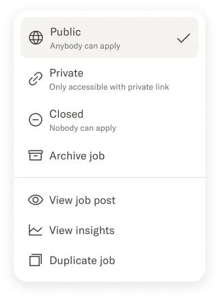- A public job is active. It’s visible on your career page and integrations, and candidates are able to apply. You’ll probably use this state the most, as it allows all candidates to apply to an open job.