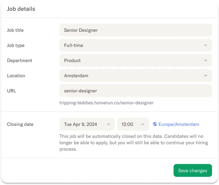 The new auto-close job feature will disable an application form on a set day, preventing candidates from applying. It will also remove the job post from your career page and from any other integrations you have set up through Homerun. This gives you and your team the time you need to focus on applicants and setting up the next steps of the recruitment process.
