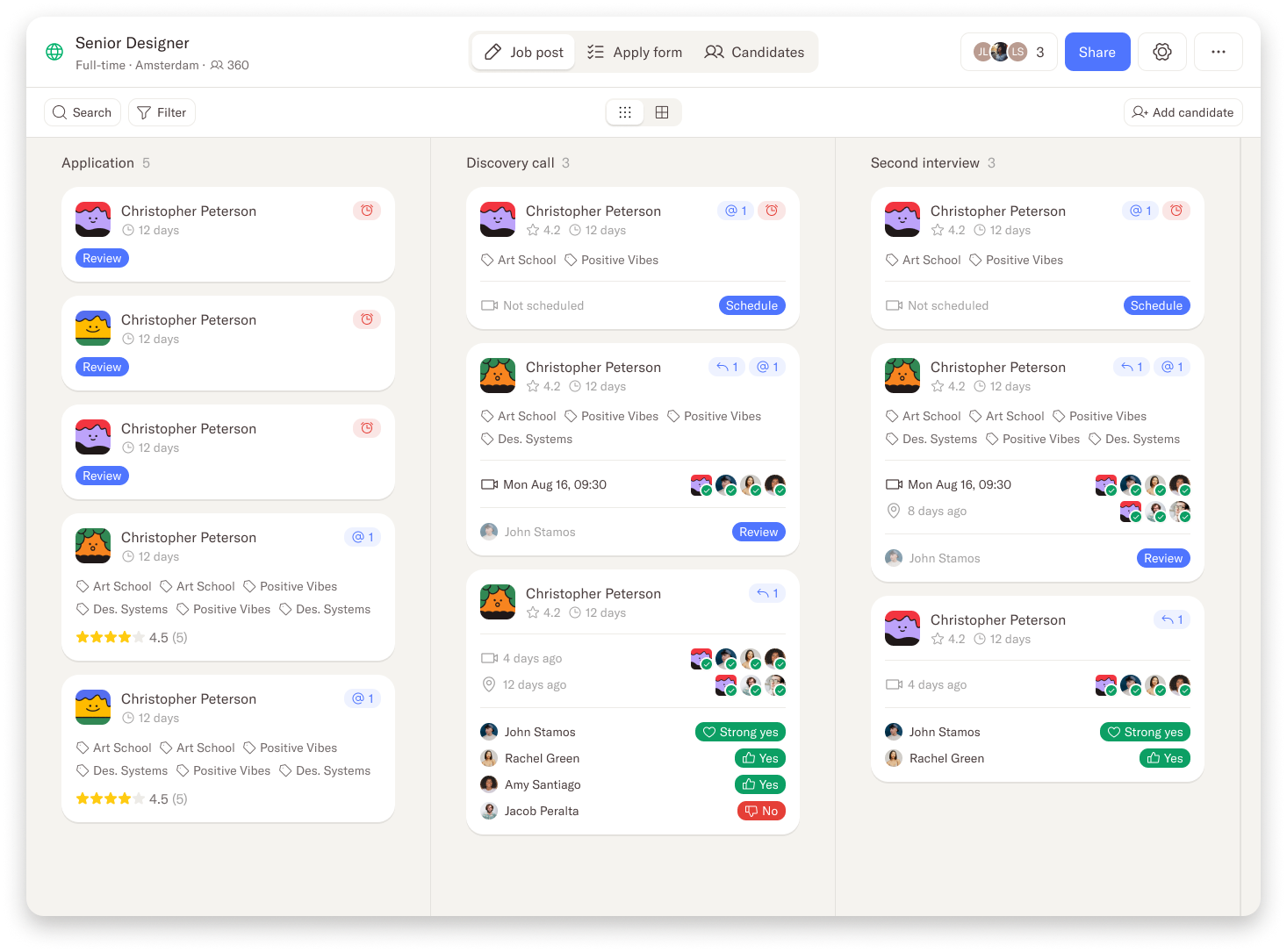 Users in a hiring team with the “Can hire” role have access to everything that’s related to candidates. This means they can review candidates, move them to another stage, disqualify them, as well as edit and message them, and schedule interviews. These users don’t have access to actions around the job post, which means they won’t be able to make any changes to the job post or the job settings.