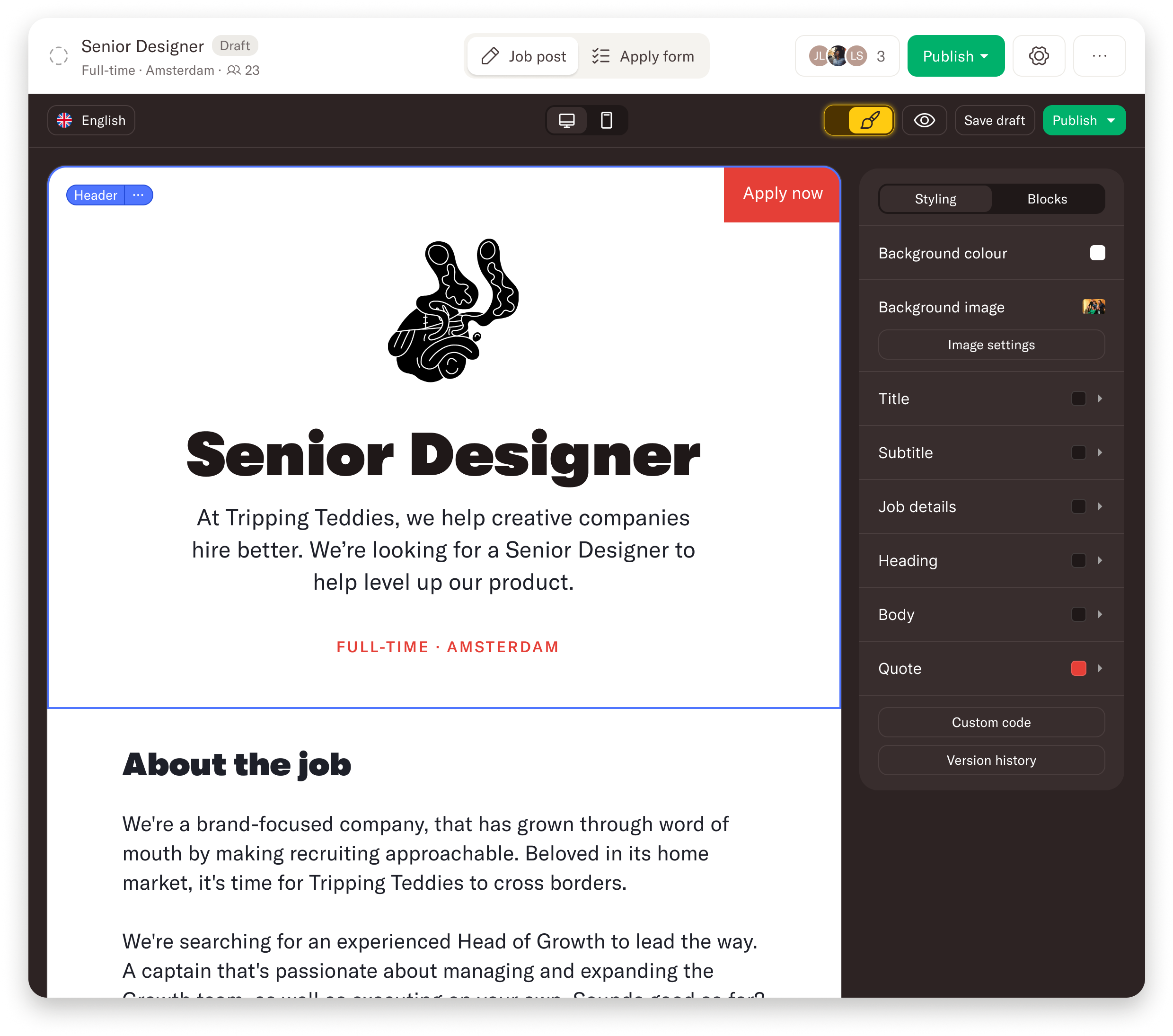 Team members that just need access to the job post, apply form, and the job settings can be assigned the “Can create” role. This means they won’t have access to candidates and can only edit information related to the job post and the apply form. If you have a designer or marketing person on the team it’s a perfect role for them as they can update the job post and make changes, but not access the candidates.