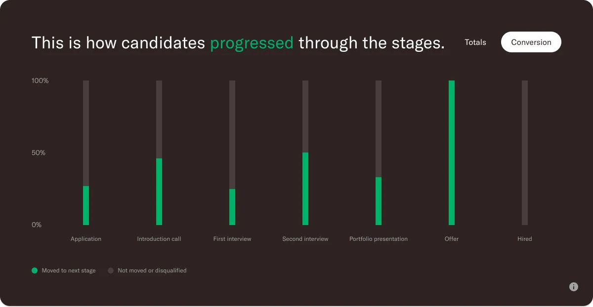 A completely new view is the hiring pipeline which shows you exactly how candidates are moving through the hiring process. It shows the number as well as the percentage of candidates progressing through the stages, and those that are disqualified or that have not moved at all.