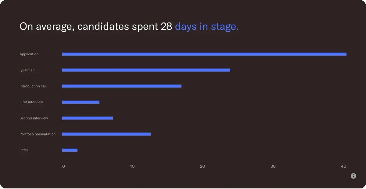 The time in stage hiring metric shows the average, minimum, and maximum number of days candidates have stayed in each stage. Checking this metric helps spot bottlenecks and delays, and learn where candidates are getting stuck. This will both help your team in the time they spent hiring, but also improve the candidate experience if you can take action.