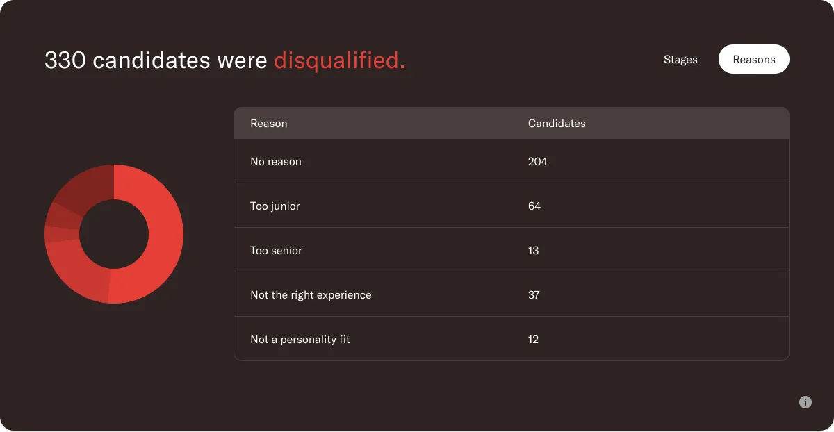 The Disqualifications per stage show you exactly where candidates were disqualified and also how they were disqualified. This view can help you gain valuable insight in the stage with the most disqualifications to set expectations for future roles, or improve screening questions at previous stages.