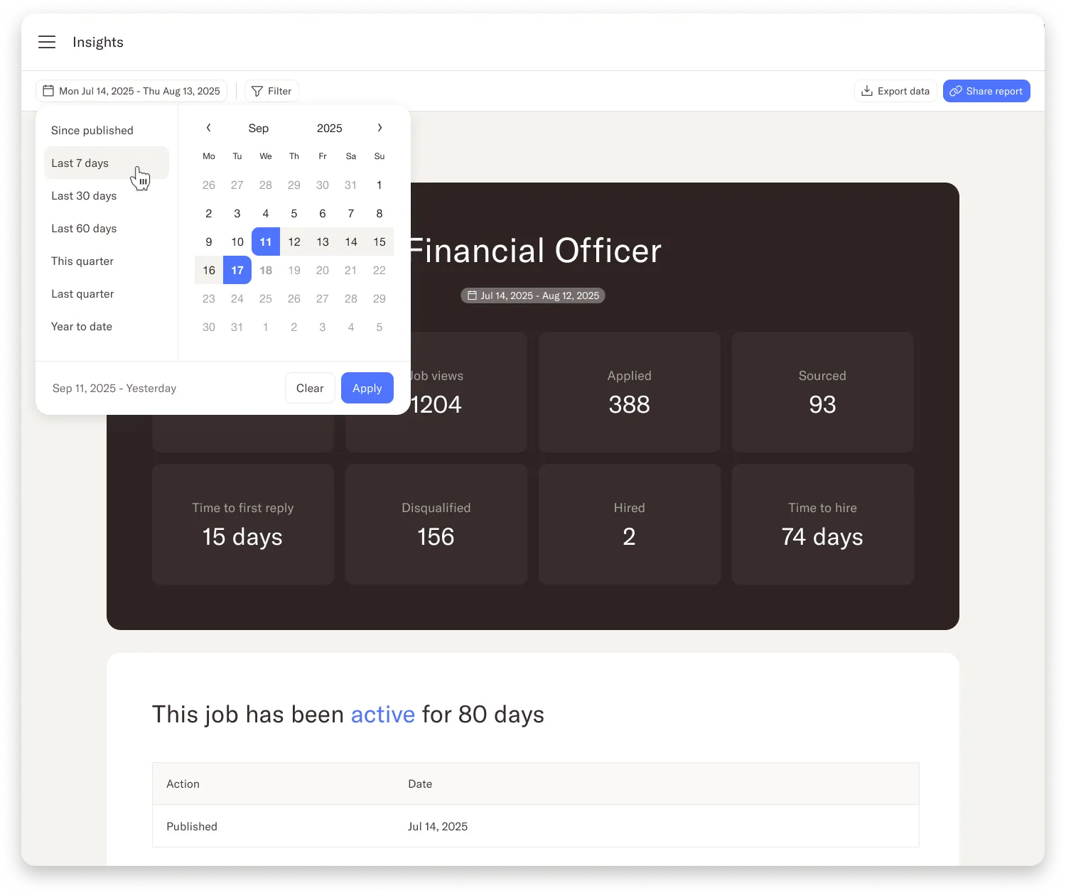 It’s now a lot simpler to select the dates for which you want to check the Insights. You can use one of the suggested time frames such as the last 7 days or the last quarter, or you can select any two dates to show hiring metrics.