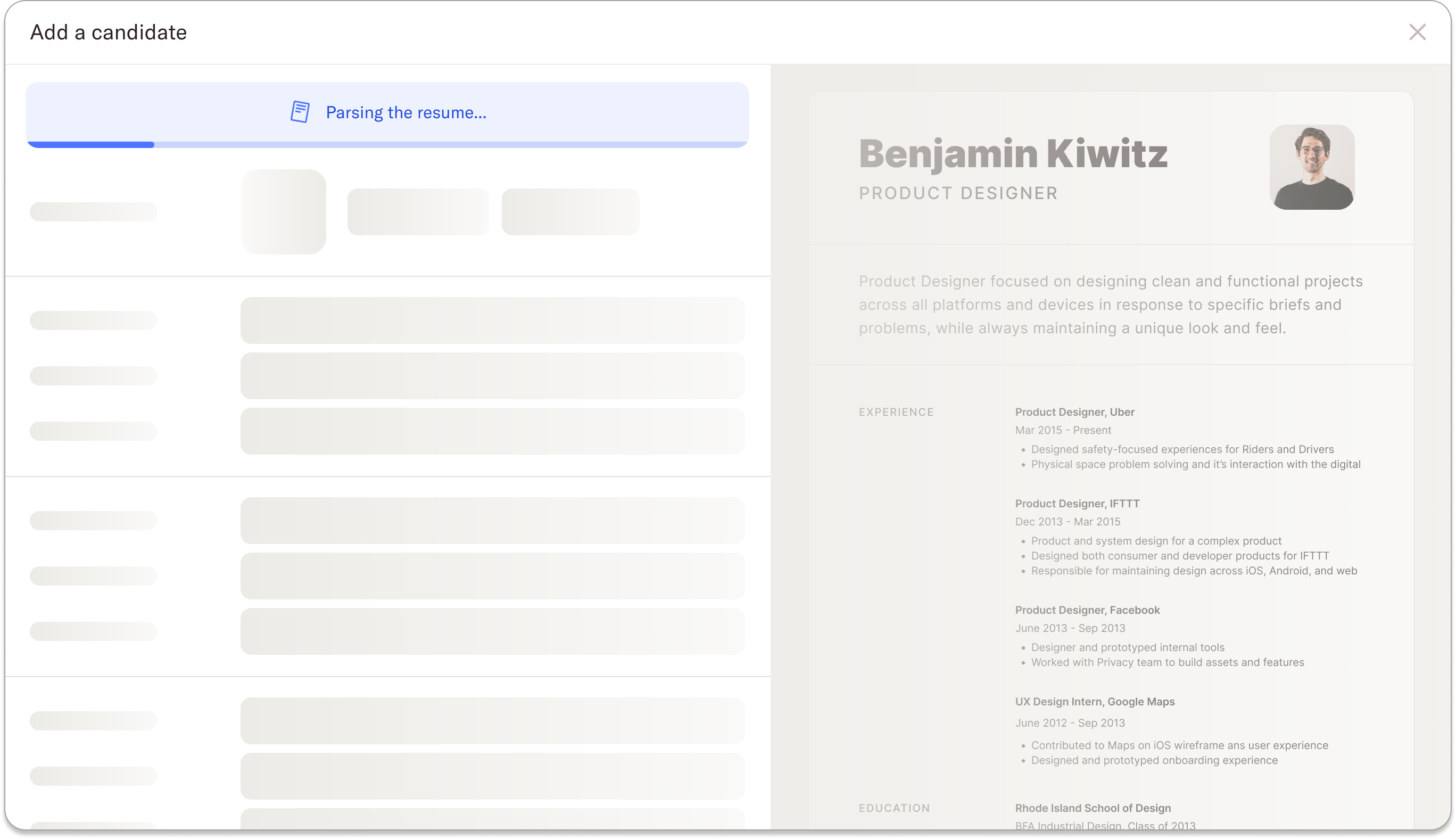 To create a candidate profile, simply upload a PDF resume to Homerun. Our system will then scan the resume to identify and extract important information, including contact details, websites, and any listed experience or education. Any available basic details will be added to the “Contact” and “About” sections of the candidate profile. We’ll also summarize the candidate’s work history and education and automatically populate the “Experience” and “Education” sections.