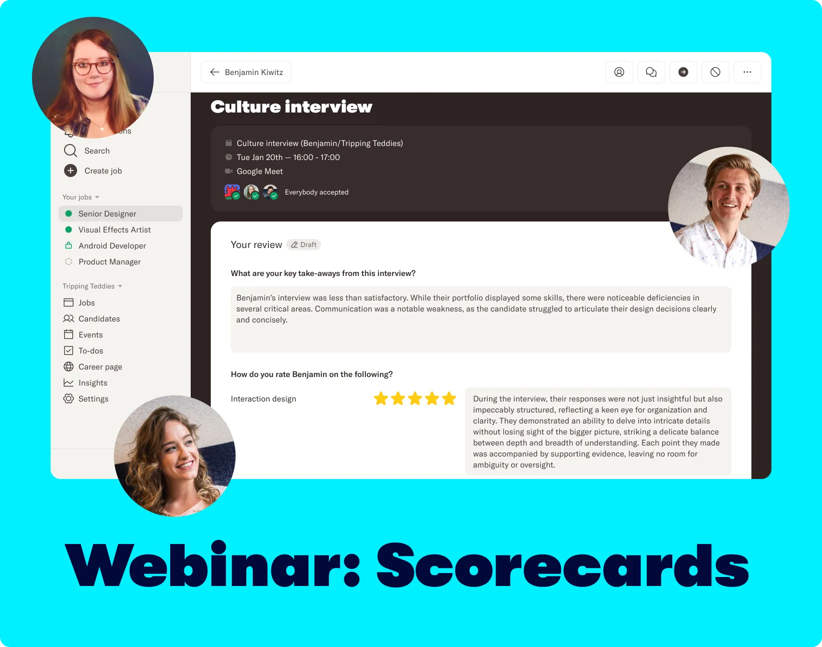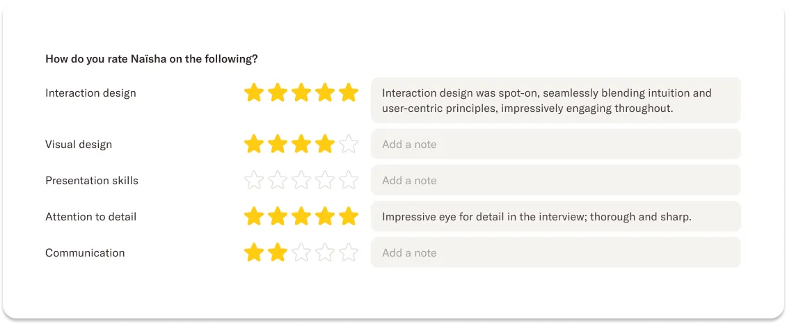 Scorecards bring structure to the way your team writes candidate reviews. You’ll also have a clear overview of the average ratings and notes from your team.