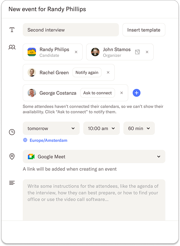 When setting up an event with a candidate, it’s important to have a clear overview of your team’s availability. If a team member hasn’t connected their calendar yet, their availability won’t appear in the scheduling view. This can make finding a suitable interview slot unnecessarily difficult and time-consuming. Instead of having to manually follow up with your team, you can now simply click the “Ask to connect” button to send them a request to connect their calendar.