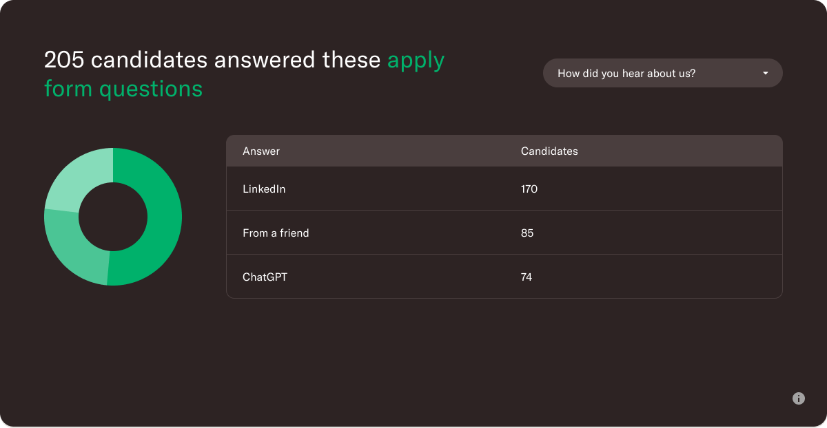 Candidate answers to multiple choice questions are now shown visually in a pie chart. This is a great way to compare answers to questions like “Where did you find this job?” or “What is your preferred office setup?” and analyse the answers.