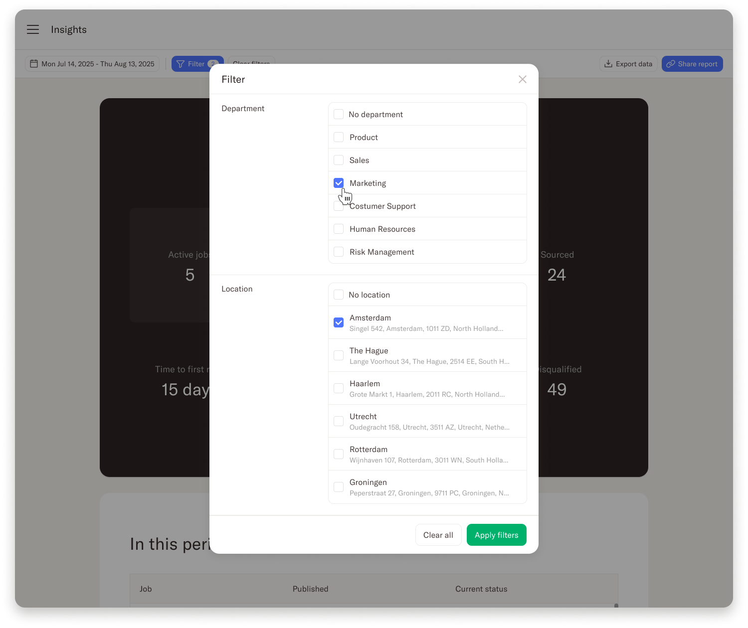 You can now filter the Company insights page on Departments as well as Locations. This allows you to review the hiring process in a more detailed way and spot where the process went well, and where you might need to optimize.